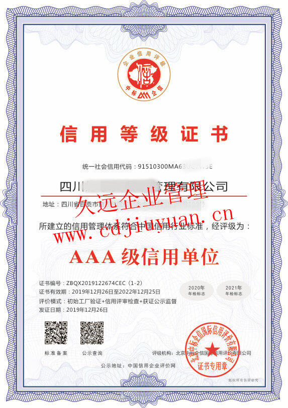 AAA級企業信用等級證書